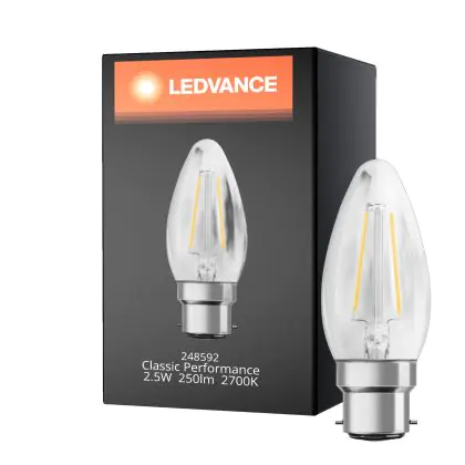 Ledvance Classic Performance LED Glühbirne B22d Kerze Fadenlampe Klar 2.5W 250lm - 827 Extra Warmweiß | Ersatz für 25W