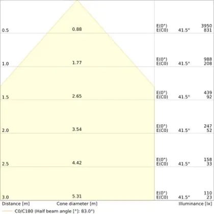 Der Abstrahlwinkel bezeichnet den Winkel, in dem das Licht aus der Lichtquelle ausgestrahlt wird. Er wird in Grad (D) angegeben. Je geringer die Gradzahl des Abstrahlwinkels ist, desto kleiner ist auch der Durchmesser des Lichtkegels, den die Lichtquelle produziert. Beispiel: Wird eine Lampe mit einem Abstrahlwinkel von 60 Grad an der Decke (2,5 m Höhe) angebracht, erzeugt sie einen Lichtkegel von 2,9 Metern Durchmesser. Hat die Lampe hingegen einen Abstrahlwinkel von 120 Grad, beträgt der Lichtkegel 8,7 Meter im Durchmesser. |