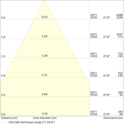 Der Abstrahlwinkel bezeichnet den Winkel, in dem das Licht aus der Lichtquelle ausgestrahlt wird. Er wird in Grad (D) angegeben. Je geringer die Gradzahl des Abstrahlwinkels ist, desto kleiner ist auch der Durchmesser des Lichtkegels, den die Lichtquelle produziert. Beispiel: Wird eine Lampe mit einem Abstrahlwinkel von 60 Grad an der Decke (2,5 m Höhe) angebracht, erzeugt sie einen Lichtkegel von 2,9 Metern Durchmesser. Hat die Lampe hingegen einen Abstrahlwinkel von 120 Grad, beträgt der Lichtkegel 8,7 Meter im Durchmesser. |