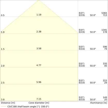 Der Abstrahlwinkel bezeichnet den Winkel, in dem das Licht aus der Lichtquelle ausgestrahlt wird. Er wird in Grad (D) angegeben. Je geringer die Gradzahl des Abstrahlwinkels ist, desto kleiner ist auch der Durchmesser des Lichtkegels, den die Lichtquelle produziert. Beispiel: Wird eine Lampe mit einem Abstrahlwinkel von 60 Grad an der Decke (2,5 m Höhe) angebracht, erzeugt sie einen Lichtkegel von 2,9 Metern Durchmesser. Hat die Lampe hingegen einen Abstrahlwinkel von 120 Grad, beträgt der Lichtkegel 8,7 Meter im Durchmesser. |
