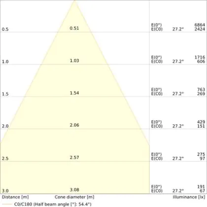 Der Abstrahlwinkel bezeichnet den Winkel, in dem das Licht aus der Lichtquelle ausgestrahlt wird. Er wird in Grad (D) angegeben. Je geringer die Gradzahl des Abstrahlwinkels ist, desto kleiner ist auch der Durchmesser des Lichtkegels, den die Lichtquelle produziert. Beispiel: Wird eine Lampe mit einem Abstrahlwinkel von 60 Grad an der Decke (2,5 m Höhe) angebracht, erzeugt sie einen Lichtkegel von 2,9 Metern Durchmesser. Hat die Lampe hingegen einen Abstrahlwinkel von 120 Grad, beträgt der Lichtkegel 8,7 Meter im Durchmesser. |