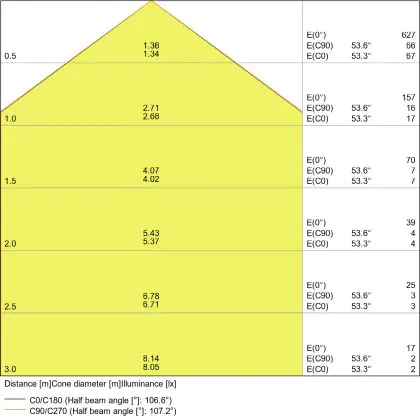 Der Abstrahlwinkel bezeichnet den Winkel, in dem das Licht aus der Lichtquelle ausgestrahlt wird. Er wird in Grad (D) angegeben. Je geringer die Gradzahl des Abstrahlwinkels ist, desto kleiner ist auch der Durchmesser des Lichtkegels, den die Lichtquelle produziert. Beispiel: Wird eine Lampe mit einem Abstrahlwinkel von 60 Grad an der Decke (2,5 m Höhe) angebracht, erzeugt sie einen Lichtkegel von 2,9 Metern Durchmesser. Hat die Lampe hingegen einen Abstrahlwinkel von 120 Grad, beträgt der Lichtkegel 8,7 Meter im Durchmesser. |