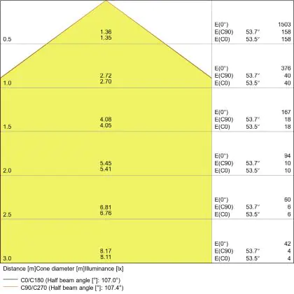 Der Abstrahlwinkel bezeichnet den Winkel, in dem das Licht aus der Lichtquelle ausgestrahlt wird. Er wird in Grad (D) angegeben. Je geringer die Gradzahl des Abstrahlwinkels ist, desto kleiner ist auch der Durchmesser des Lichtkegels, den die Lichtquelle produziert. Beispiel: Wird eine Lampe mit einem Abstrahlwinkel von 60 Grad an der Decke (2,5 m Höhe) angebracht, erzeugt sie einen Lichtkegel von 2,9 Metern Durchmesser. Hat die Lampe hingegen einen Abstrahlwinkel von 120 Grad, beträgt der Lichtkegel 8,7 Meter im Durchmesser. |
