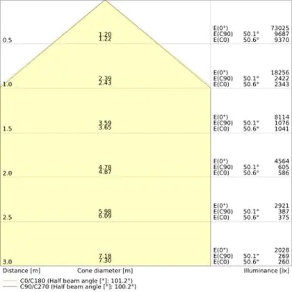 Der Abstrahlwinkel bezeichnet den Winkel, in dem das Licht aus der Lichtquelle ausgestrahlt wird. Er wird in Grad (D) angegeben. Je geringer die Gradzahl des Abstrahlwinkels ist, desto kleiner ist auch der Durchmesser des Lichtkegels, den die Lichtquelle produziert. Beispiel: Wird eine Lampe mit einem Abstrahlwinkel von 60 Grad an der Decke (2,5 m Höhe) angebracht, erzeugt sie einen Lichtkegel von 2,9 Metern Durchmesser. Hat die Lampe hingegen einen Abstrahlwinkel von 120 Grad, beträgt der Lichtkegel 8,7 Meter im Durchmesser. |