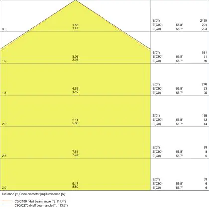 Der Abstrahlwinkel bezeichnet den Winkel, in dem das Licht aus der Lichtquelle ausgestrahlt wird. Er wird in Grad (D) angegeben. Je geringer die Gradzahl des Abstrahlwinkels ist, desto kleiner ist auch der Durchmesser des Lichtkegels, den die Lichtquelle produziert. Beispiel: Wird eine Lampe mit einem Abstrahlwinkel von 60 Grad an der Decke (2,5 m Höhe) angebracht, erzeugt sie einen Lichtkegel von 2,9 Metern Durchmesser. Hat die Lampe hingegen einen Abstrahlwinkel von 120 Grad, beträgt der Lichtkegel 8,7 Meter im Durchmesser. |