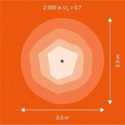 Der Abstrahlwinkel bezeichnet den Winkel, in dem das Licht aus der Lichtquelle ausgestrahlt wird. Er wird in Grad (D) angegeben. Je geringer die Gradzahl des Abstrahlwinkels ist, desto kleiner ist auch der Durchmesser des Lichtkegels, den die Lichtquelle produziert. Beispiel: Wird eine Lampe mit einem Abstrahlwinkel von 60 Grad an der Decke (2,5 m Höhe) angebracht, erzeugt sie einen Lichtkegel von 2,9 Metern Durchmesser. Hat die Lampe hingegen einen Abstrahlwinkel von 120 Grad, beträgt der Lichtkegel 8,7 Meter im Durchmesser. |