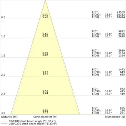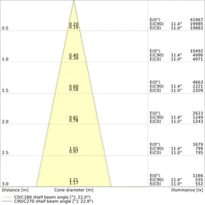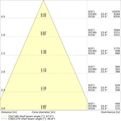 Der Abstrahlwinkel bezeichnet den Winkel, in dem das Licht aus der Lichtquelle ausgestrahlt wird. Er wird in Grad (D) angegeben. Je geringer die Gradzahl des Abstrahlwinkels ist, desto kleiner ist auch der Durchmesser des Lichtkegels, den die Lichtquelle produziert. Beispiel: Wird eine Lampe mit einem Abstrahlwinkel von 60 Grad an der Decke (2,5 m Höhe) angebracht, erzeugt sie einen Lichtkegel von 2,9 Metern Durchmesser. Hat die Lampe hingegen einen Abstrahlwinkel von 120 Grad, beträgt der Lichtkegel 8,7 Meter im Durchmesser. |