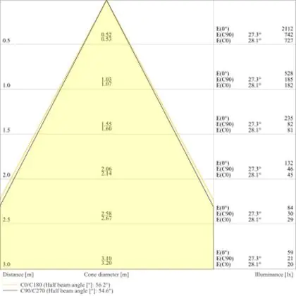 Der Abstrahlwinkel bezeichnet den Winkel, in dem das Licht aus der Lichtquelle ausgestrahlt wird. Er wird in Grad (D) angegeben. Je geringer die Gradzahl des Abstrahlwinkels ist, desto kleiner ist auch der Durchmesser des Lichtkegels, den die Lichtquelle produziert. Beispiel: Wird eine Lampe mit einem Abstrahlwinkel von 60 Grad an der Decke (2,5 m Höhe) angebracht, erzeugt sie einen Lichtkegel von 2,9 Metern Durchmesser. Hat die Lampe hingegen einen Abstrahlwinkel von 120 Grad, beträgt der Lichtkegel 8,7 Meter im Durchmesser. |