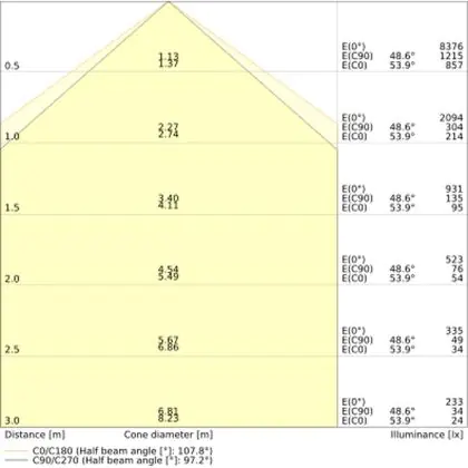 Der Abstrahlwinkel bezeichnet den Winkel, in dem das Licht aus der Lichtquelle ausgestrahlt wird. Er wird in Grad (D) angegeben. Je geringer die Gradzahl des Abstrahlwinkels ist, desto kleiner ist auch der Durchmesser des Lichtkegels, den die Lichtquelle produziert. Beispiel: Wird eine Lampe mit einem Abstrahlwinkel von 60 Grad an der Decke (2,5 m Höhe) angebracht, erzeugt sie einen Lichtkegel von 2,9 Metern Durchmesser. Hat die Lampe hingegen einen Abstrahlwinkel von 120 Grad, beträgt der Lichtkegel 8,7 Meter im Durchmesser. |