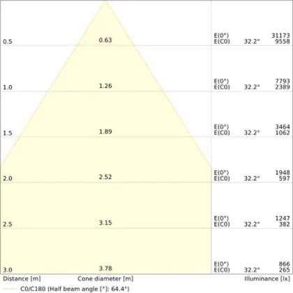 Der Abstrahlwinkel bezeichnet den Winkel, in dem das Licht aus der Lichtquelle ausgestrahlt wird. Er wird in Grad (D) angegeben. Je geringer die Gradzahl des Abstrahlwinkels ist, desto kleiner ist auch der Durchmesser des Lichtkegels, den die Lichtquelle produziert. Beispiel: Wird eine Lampe mit einem Abstrahlwinkel von 60 Grad an der Decke (2,5 m Höhe) angebracht, erzeugt sie einen Lichtkegel von 2,9 Metern Durchmesser. Hat die Lampe hingegen einen Abstrahlwinkel von 120 Grad, beträgt der Lichtkegel 8,7 Meter im Durchmesser. |