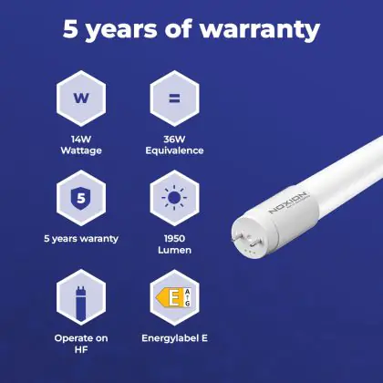 Bei der Noxion LED Röhre T8 Avant Extreme (HF) High Output 14W 1950lm - 830 Warmweiß | 120cm - Ersatz für 36W handelt es sich um eine energieeffiziente LED-Röhre. Sie ersetzt Ihre konventionelle Leuchtstoffröhre mit 36W. Die Röhre ist 1200 mm lang und hat die Farbtemperatur 3000K - Warmweiss. Die durchschnittliche Lebensdauer der LED-Röhre beläuft sich auf 50000 Stunden. Wir bieten Ihnen für dieses Produkt eine Garantie von 5 Jahre an.
