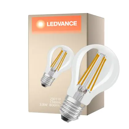 Cette ampoule Ledvance Classic LED E27 Poire Filament Claire 3.8W 806lm - 827 Blanc Très Chaud | Équivalent 60W est l’alternative idéale pour la remplacement de votre ampoule classique de 60 W. La technologie LED intégrée vous offrira de nombreux avantages. Les ampoules à incandescence traditionnelles ont une durée de vie limitée. Cette alternative LED vous permettra de profiter d’un éclairage durable et fiable.