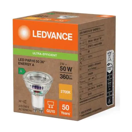 Description Ledvance LED PAR16 GU10 Réflecteur 2W 360lm 36D - 827 Blanc Très Chaud | Équivalent 50W