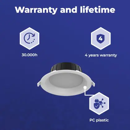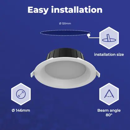 Les spots LED encastrables (aussi appelés Downlights) sont des solution éco-énergétiques permettant de remplacer les spots classiques équipés de technologie à fluorescence. Ce downlight Noxion Downlight LED Hera Moyen Encastré Blanc 9W 900lm 80D - 827-830-840 CCT | 146mm - Diamètre 120mm est conçu pour remplacer un spot classique de . La consommation de ce downlight LED est considérablement plus faible qu’un luminaire classique, à savoir, seulement 9 watts. Une économie d’énergie sans compromettre la qualité de la lumière. Le flux lumineux est de 900 lumens. La lumière de ce downlight LED est diffusé à 80 degrés et offre un bon rendu des couleurs. La durée de vie moyenne de ce luminaire LED est de 30000 heures.