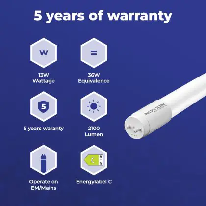 Ce tube LED Noxion Tube LED T8 Avant Extreme (EM/Direct 230V) High Output 13W 2100lm - 840 Blanc Froid | 120cm - Équivalent 36W est l’un des produits les plus éconergétiques en remplacement des tubes T8 classiques. Avec ce tube LED vous êtes donc assuré de sa qualité. Avec une puissance de seulement 13 W, ce tube LED a la même intensité lumineuse qu’un tube classique qui consomme 36 W. P>