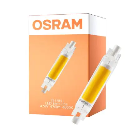 Osram LED Slim Line R7S LED R7S 78mm Claire 4.5W 470lm - 840 Blanc Froid | Équivalent 40W est une ampoule tubulaire linéaire à double extrémité. Ce type d’ampoule permet de délivrer une lumière homogène à 360° avec comme température de couleur 4000K - Blanc Froid. Cette ampoule LED R7s de chez Osram est la solution idéale pour le remplacement de vos anciennes ampoules halogènes. Cette ampoule LED n’a pas besoin de transformateur, elle fonctionne avec 230V et peut se connecter directement sur le secteur électrique.