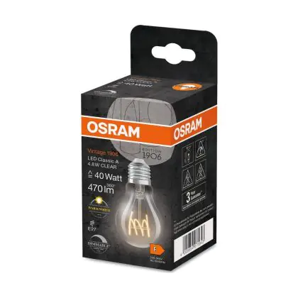 Cette ampoule Osram Vintage 1906 LED Classic Slim E27 Poire Filament Claire 4.8W 470lm - 827 Blanc Très Chaud | Dimmable - Équivalent 40W est l’alternative idéale pour la remplacement de votre ampoule classique de 40 W. La technologie LED intégrée vous offrira de nombreux avantages. Les ampoules à incandescence traditionnelles ont une durée de vie limitée. Cette alternative LED vous permettra de profiter d’un éclairage durable et fiable.