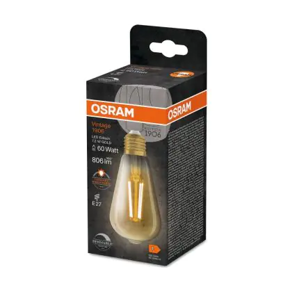 Description Osram Vintage 1906 LED E27 Edison Filament Dorée 7.2W 806lm - 824 Blanc Très Chaud | Équivalent 60W