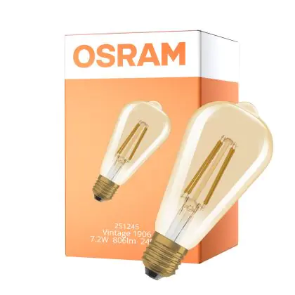 Cette ampoule Osram Vintage 1906 LED E27 Edison Filament Dorée 7.2W 806lm - 824 Blanc Très Chaud | Équivalent 60W est l’alternative idéale pour la remplacement de votre ampoule classique de 60 W. La technologie LED intégrée vous offrira de nombreux avantages. Les ampoules à incandescence traditionnelles ont une durée de vie limitée. Cette alternative LED vous permettra de profiter d’un éclairage durable et fiable.
