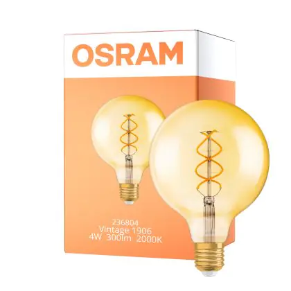 Cette ampoule Osram Vintage 1906 LED E27 Globe Filament Goud 125mm 4W 300lm - 820 Zeer Warm Wit | Dimbaar - Vervangt 28W est l’alternative idéale pour la remplacement de votre ampoule classique de 28 W. La technologie LED intégrée vous offrira de nombreux avantages. Les ampoules à incandescence traditionnelles ont une durée de vie limitée. Cette alternative LED vous permettra de profiter d’un éclairage durable et fiable.