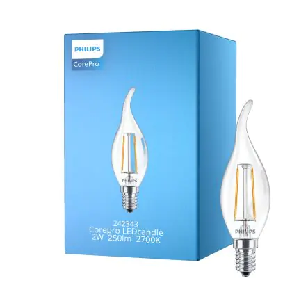 Cette ampoule Philips Corepro LED Bougie E14 Flamme Filament Claire 2W 250lm - 827 Blanc Très Chaud | Équivalent 25W avec son efficacité lumineuse de lumen par watt vous permettra de profiter d’un éclairage de qualité. Avec sa durée de vie de 15000 heures, vous n’aurez pas à vous soucier de son remplacement avant quelques années.