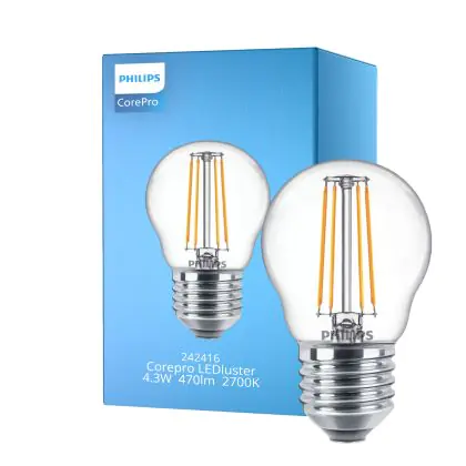 Cette ampoule Philips Corepro LED Lustre E27 Boule Filament Claire 4.3W 470lm - 827 Blanc Très Chaud | Équivalent 40W est l’alternative idéale pour la remplacement de votre ampoule classique de 40 W. La technologie LED intégrée vous offrira de nombreux avantages. Les ampoules à incandescence traditionnelles ont une durée de vie limitée. Cette alternative LED vous permettra de profiter d’un éclairage durable et fiable.